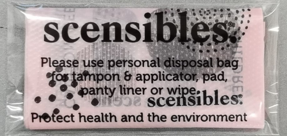SCENSIBLES guest disposal packs provide a simple, discreet solution for feminine hygiene disposal in guest bathrooms. Each pack includes two individual bags and is imprinted with clear instructions to encourage guests not to flush tampons—helping prevent costly plumbing issues.